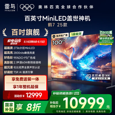 FFALCON雷鸟电视 100鹤7 25款 100英寸 MiniLED 高阶VA 国家补贴98/100英寸电视机100R685C MAX目前活动价:12999元!