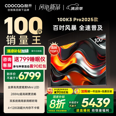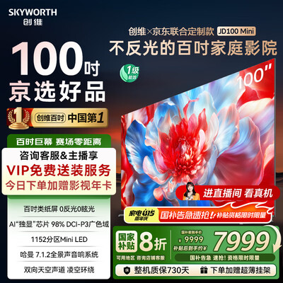 创维×京东联合定制款电视JD100 Mini 100英寸mini led 液晶游戏大屏电视机100吋 国家补贴A5F升级款目前活动价:7999.2元!