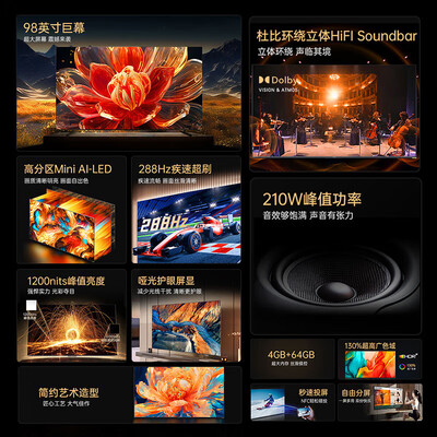 康佳旗舰店 优惠+礼包 100/98英寸144分区 288Hz游戏电视4K超清巨幕智能液晶会议平板家电墙纸电视 98英寸 4+64G/288刷/98G7 PRO 咨询立减XXX,咨询包满意价格目前活动价:6999元!