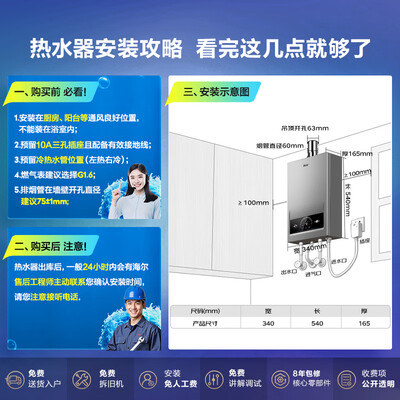海尔燃气热水器KN7S收到货后自己动手安装成功,出热水很快,外观漂亮,数字显示大气,待用一段时间再追评!家里旧得10l机器用了8年了,洗澡忽冷忽热,这次换了这款昨天装好试了一下很满意,希望接下来一直如此外观漂亮,使用了几天效果非常好,可以手机控制,省心省力,非常愉快的一次购物。我家还在装修,安装师傅很细心。热水器装好了以后还拿纸板给我盖上了。谢谢,好评!颜值真心高,安装师傅说从没安装过,是新款,支持wifi。新房真在装修中等到使用后再来追评。哈哈