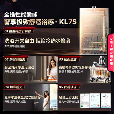海尔燃气热水器KL7S和海尔小海鲸KL5GT哪个好?区别有没有?海尔燃气热水器KL7S海尔燃气热水器KL7S这款燃气热水器真的太漂亮了,款式和质量真的是好。安装师傅态度也很好,很满意的一次购物。第二次回购这个海尔燃气热水器KL7S热水器了,质量一直很放心!冷热水也很稳定。客服小杨也很热情有耐心!约的师傅准时上门安装,特别认真热情,安装技术也不错,工作态度棒棒的京东物流好快,师傅安装态度好,安装后使用起来很方便,出水量很大。赞一个发货很快。预约安装师傅也很及时。出热水很稳定,看上去很美观,售后跟进也很及时。挺满意的。
