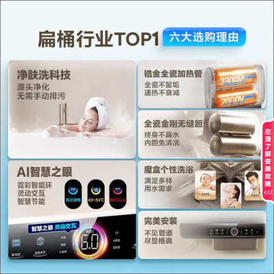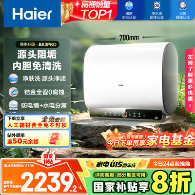 海尔(Haier)国家补贴20%双胆扁桶电热水器60升 BK3PRO 小魔盒鲜活水 净肤洗AI智慧 3300W速热免清洗镁棒免更换目前活动价:2199.2元!
