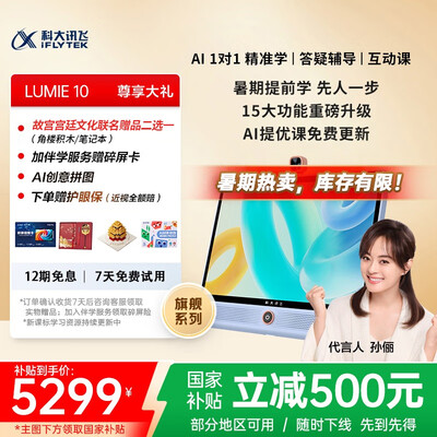 科大讯飞学习机LUMIE10用了3年的3终于替换成,简直不要太爽,速度快到飞起,屏幕和音质提升明显,轻中度办公不在话下,强烈推荐入手关注了好长时间,6.18有活动,果断拿下,高大上,份量有点重,老婆很喜欢,快递小哥也很给力,必须五星好评!物超所值,外观漂亮,运行流畅不卡顿,非常值得购买,物流也很给力拿到后宝宝就马上用了起来,主要是看中了护眼功能,内置的资源还有待探索。是我想要的,孩子非常喜欢,爱不释手,喜欢探索宝贝里的知识,功能强大对孩子帮助很大