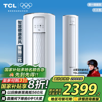 TCL空调大2匹新一级能效节能省电变频冷暖防直吹客厅空调立式柜机家用空调 以旧换新 国家补贴 大2匹 一级能效 智锦II柔风空调首页购物车我的客服手机查看反馈提建议举报家配师目前活动价:2999元!