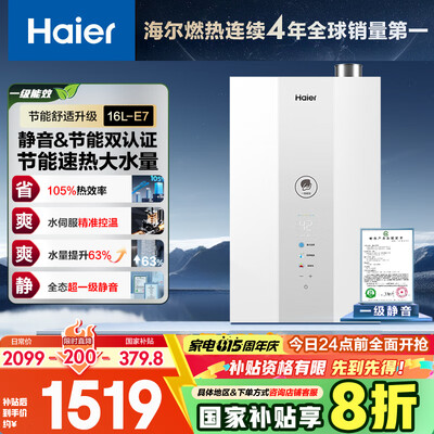 海尔(Haier)【E系列E7一级能效】16升燃气热水器天然气 增压水伺服恒温一级静音【国家补贴20%】节能 以旧换新目前活动价:1519.2元!