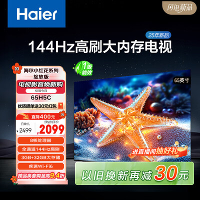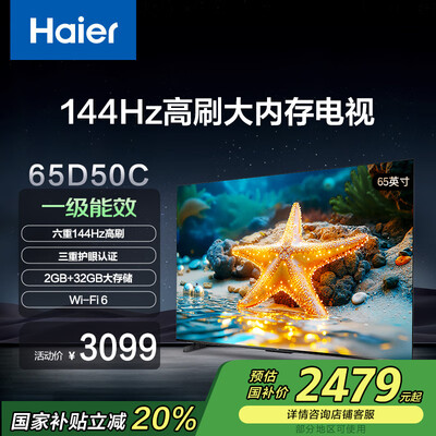 海尔(Haier)65D50C 65英寸4K超高清144Hz高刷高色域全面屏2+32GB超薄游戏智能液晶平板电视机一级能效目前活动价:3099元!