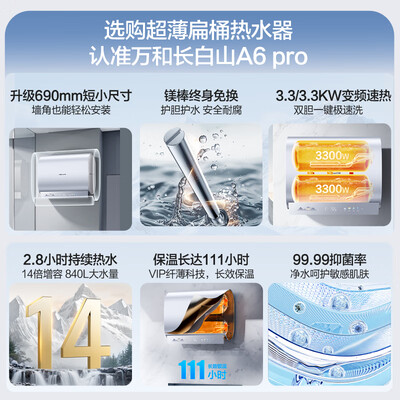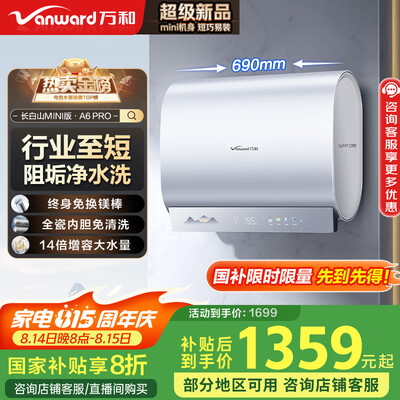 万和(Vanward)【长白山A6-Pro-33】行业至短超薄双胆扁桶电热水器60升3300W净肤洗国家补贴一级能效镁棒终身免换目前活动价:1358.4元!