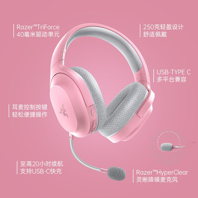 雷蛇(Razer)游戏耳机看到包装盒子以为是战损版,拆开盒子是是崭新出厂,无线耳机真的,想要桌面整洁还得是无线啊蛮不错的,无线是真的爽,电量也挺耐用的做工质感:质感还可以,及格了音质音效:挺好舒适度:很轻,待着很舒服,而且耳朵不会难受灵敏度:都蛮好的,每次用要按开机键有点麻烦很轻,耳罩也够大了。总体很棒,但电流麦严重,如果不用麦,是个很有性价比的无线耳机做工质感:耳罩是棉的,不容易划破,摸着还可以音质音效:用来打fps游戏还行,可能需要稍微调一下音舒适度:很舒服,头刚好包住灵敏度:基本上没有延迟,就是耳麦声音有点轻