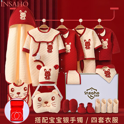 INSAHO 婴儿衣服新生儿礼盒全棉春夏秋冬宝宝套装满月过年礼物母婴用品 YEF083 保暖款套装(礼盒+银手镯)到手价格389.0元。