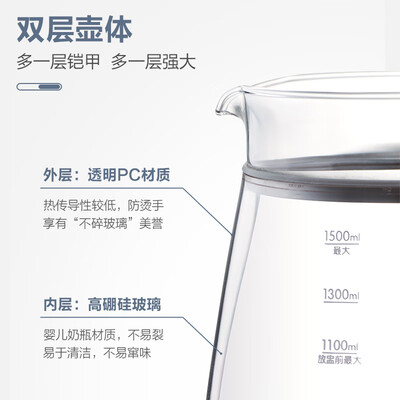 苏泊尔(SUPOR)养生壶这是买的第二个这个壶了,家里一个,办公室一个,大小800毫升,特别合适,上午一壶水下午一壶水,保证一天的进水量。如果沏茶也特别好清洗。小哥很礼貌,很喜欢这一款的外观,颜色和家里的装修风格很搭配,喜欢的宝宝赶紧下手东西比我想象中的还要完美,已经多次回购了,显示很时尚高效,为颜值买单,京东保我售后,高度赞扬,果断又买一台,大气不俗,儒雅内涵,平时一直用这个模式,还省电,这个特别好用,已经收到货了,以后还会关注这家店铺的,这次购物很成功容量大小:1500ml好像是外观材质:玻璃的比较好用带一个底盘操作方式:可以烧水煮茶煮粥等等等等功能菜单:好几项吧记不清了保温预约:这个功能很实用的但是我一直没搞明白买了款美的养生壶收到后从外观上看确实的不错,与商家描述的一致,从外观上来看就相当大气,透明玻璃一眼望穿再加上304食用材质,更迷人1.5L大容量可以烧水,煮蛋,煮茶,多种功能的设计,值得推荐。