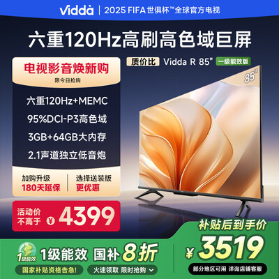 Vidda 海信电视85英寸 R85 120Hz高刷 3+64G 一级能效家电国家补贴以旧换新游戏液晶电视巨幕85V1KD-S首页购物车我的客服手机查看反馈到手价格4399元。