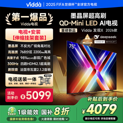 Vidda发现X 2026款 75英寸【伸缩挂架 送装一体版】 300Hz超高刷 墨晶屏 QD-Mini LED 以旧换新家电补贴首页购物车我的客服手机查看反馈到手价格5299元。
