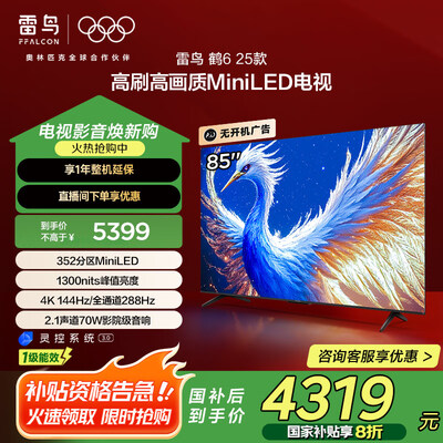 FFALCON雷鸟 鹤6 25款 85英寸MiniLED电视 家电国家补贴 288Hz高刷 4+64GB 一级能效电视机85S595C鹤625款首页购物车我的客服手机查看反馈到手价格5389元。