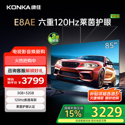康佳电视 85E8AE 85英寸 3+32G 120Hz MEMC护眼电视 4K超清全面屏 平板电视巨幕大屏 二级能效国家补贴首页购物车我的客服手机查看反馈目前活动价:4199元!