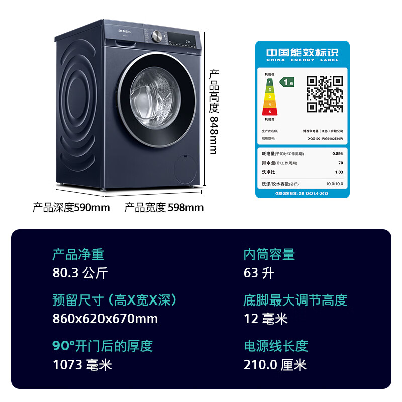 二、西门子洗衣机XQG100-WG54A2E10W产品参数: