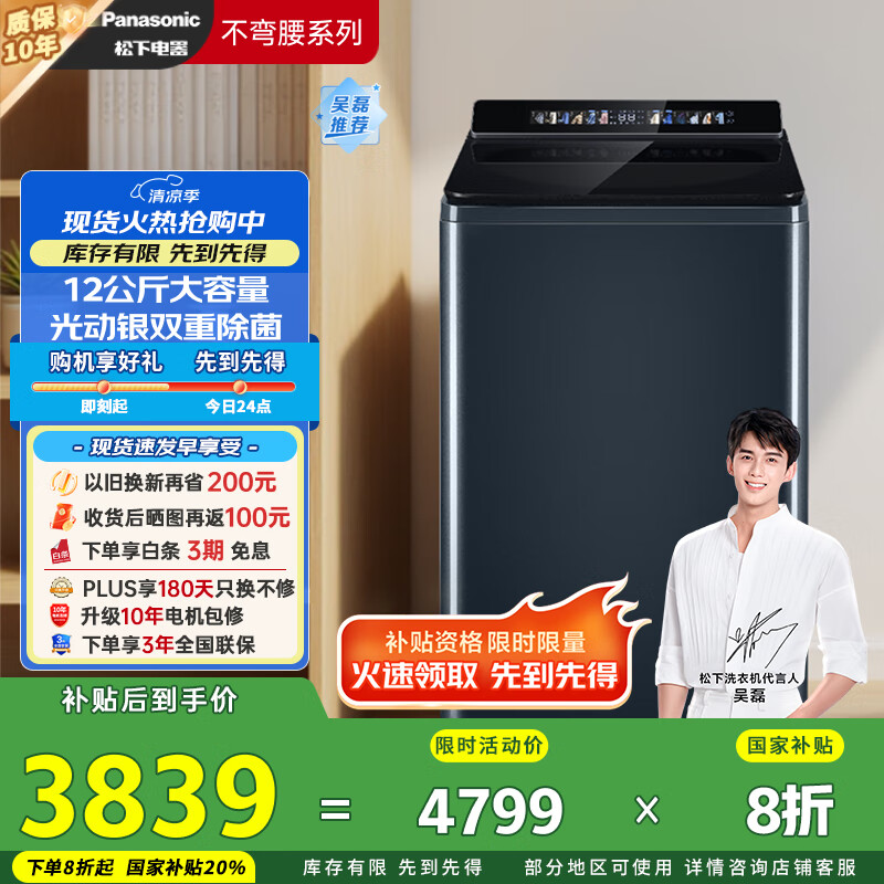 松下(Panasonic)波轮洗衣机全自动12公斤大容量除菌除螨羽绒内衣洗衣机彩屏 国家补贴 不弯腰U2F1到手价格4999元。