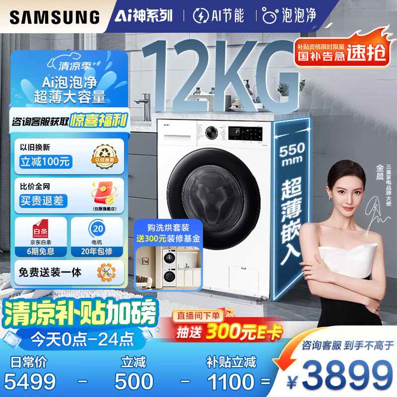 三星(SAMSUNG)AI神洗衣机5系 12KG全自动滚筒AI泡泡净蒸汽除菌超薄嵌入国家补贴20% 白 WW12DG5B24AWSC到手价格4899元。