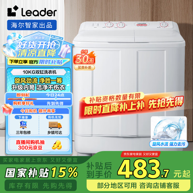统帅(Leader)海尔智家 半自动双桶洗衣机10公斤 旋风水流强力去污 以旧换新 家电国家补贴 1188BS到手价格499元。
