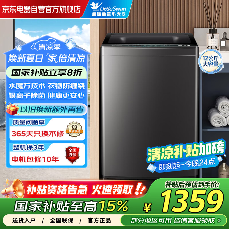 小天鹅(LittleSwan)波轮全自动洗衣机12公斤大容量水魔方防缠绕 纳米银离子除菌健康除螨 家用国家补贴到手价格1599元。