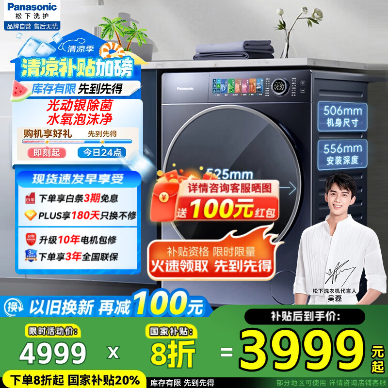 松下(Panasonic)全自动滚筒洗衣机10公斤超薄彩屏小薄荷SPro光动银除菌泡沫净1.1洗净比智控XQG100-M1G7国家补贴到手价格4999元。