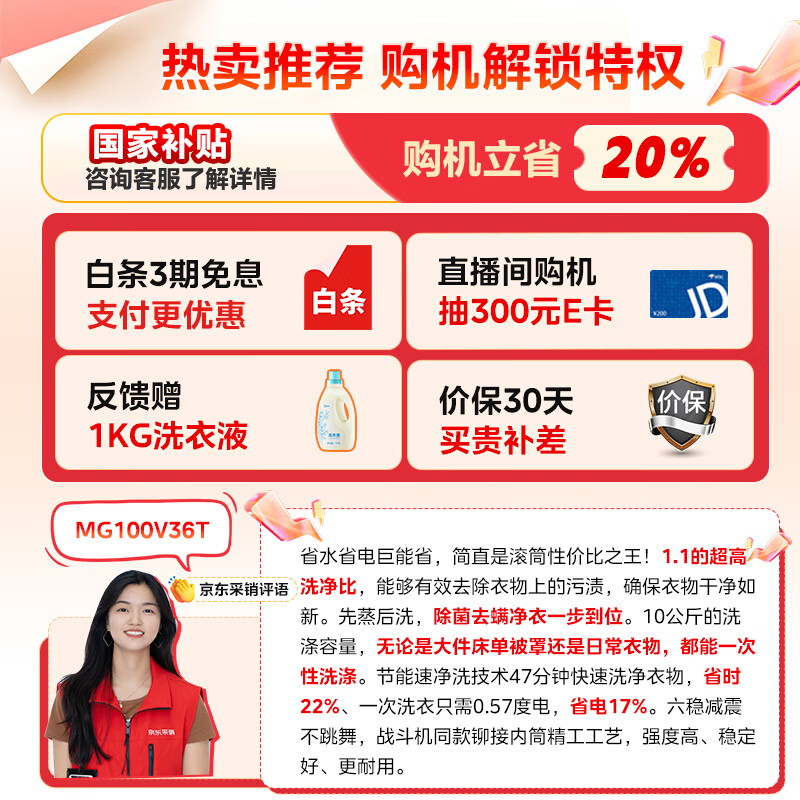 美的(Midea)滚筒洗衣机全自动家用【MG100V36T】懒人超薄10公斤 以旧换新 家电国家补贴20% 一级能效 内衣洗 到手价格1382元。