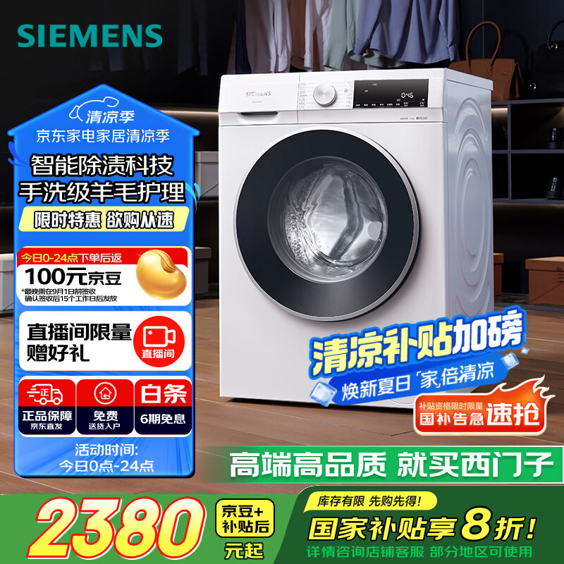 西门子(SIEMENS)iQ300 10公斤滚筒洗衣机全自动 智能除渍 强效除螨 防过敏 15分钟快洗 100AW 家电国家补贴到手价格2899元。