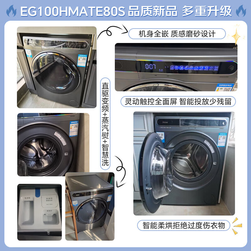 洗衣机海尔EG100HMATE80S哪个好?区别大不大?这款海尔(Haier)10公斤滚筒洗衣机直驱电机洗烘一体 晶彩触控 超薄平嵌 智能投放双喷淋防残留EG100HMATE80S确实是很nice的,完美的设计造型风格,做工十分考究,有朋友想知道这款海尔EG100HMATE80S怎么样?有谁用过?说真心话这洗衣机海尔EG100HMATE80S个人使用体验后觉得蛮不错的,才购买没多久的,洗烘套装非常好看,颜值很高,功能齐全,月光宝盒,系列,治愈系,总之非常好,品牌好,所以一开始毫不犹豫下单,快递很快,安装小哥非常耐心,因为龙头位置比较刁钻,还很细心帮忙找办法,帮忙处理到位。一次非常不错的购物体验外形外观:好看洗净效果:使用以后很不错除菌效果:很好容量大小:容量很大 洗衣机海尔EG100HMATE80S洗衣机收到了 给宝宝洗衣服的 的 容量挺大的 挑选了很久选了这款 很满意 挺精心的 不错 是不错的选择 也推荐给朋友买了 洗衣机现在是真划算 还有国补 想买的赶紧买 能省很多。外形外观:好看容量大小:不大不小 收到货后发现真的很赞(=。包装非常好,里三层外三层,风雨不透,水泄不通,拆了我很久_打开后宝贝就跟图片上一样,很是惊喜! 双期间买的洗衣机,质量非常非常的好。声音很轻,几乎听不到。比我之前买的那个心情好多了。