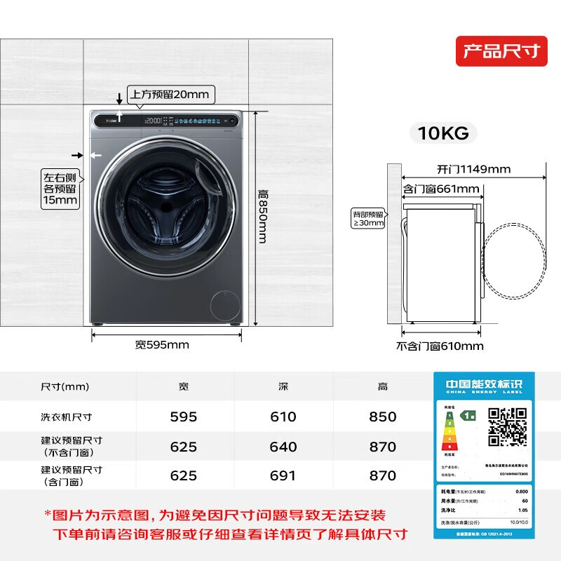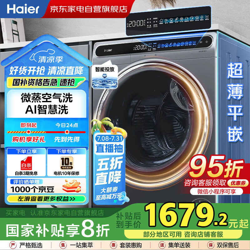 海尔(Haier)10公斤滚筒洗衣机直驱电机洗烘一体 晶彩触控 超薄平嵌 智能投放双喷淋防残留EG100HMATE80S到手价格2499元。
