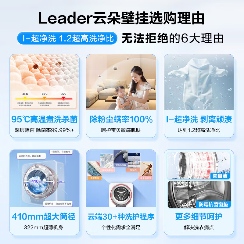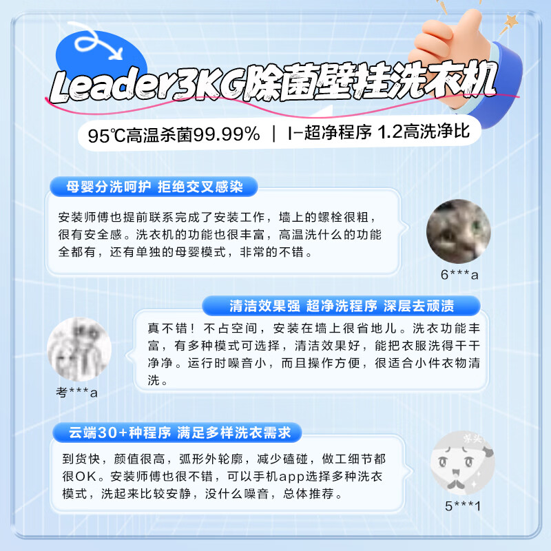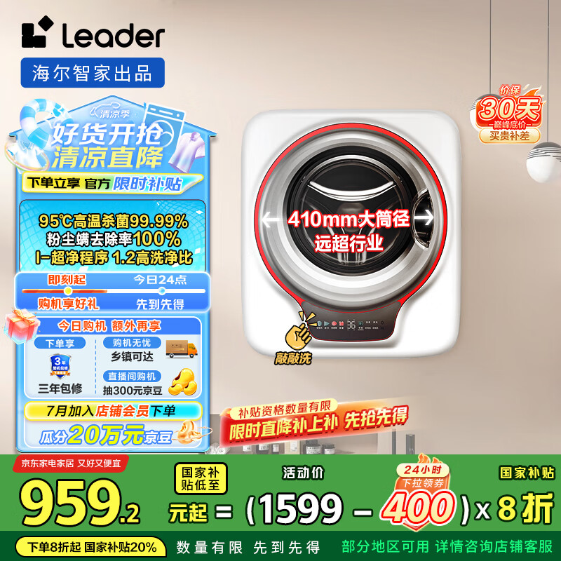 统帅(Leader)海尔智家出品全自动内衣婴儿壁挂迷你洗衣机 3KG除菌懒人洗衣机国家补贴一级能效TQGM30-B833U1到手价格1599元。