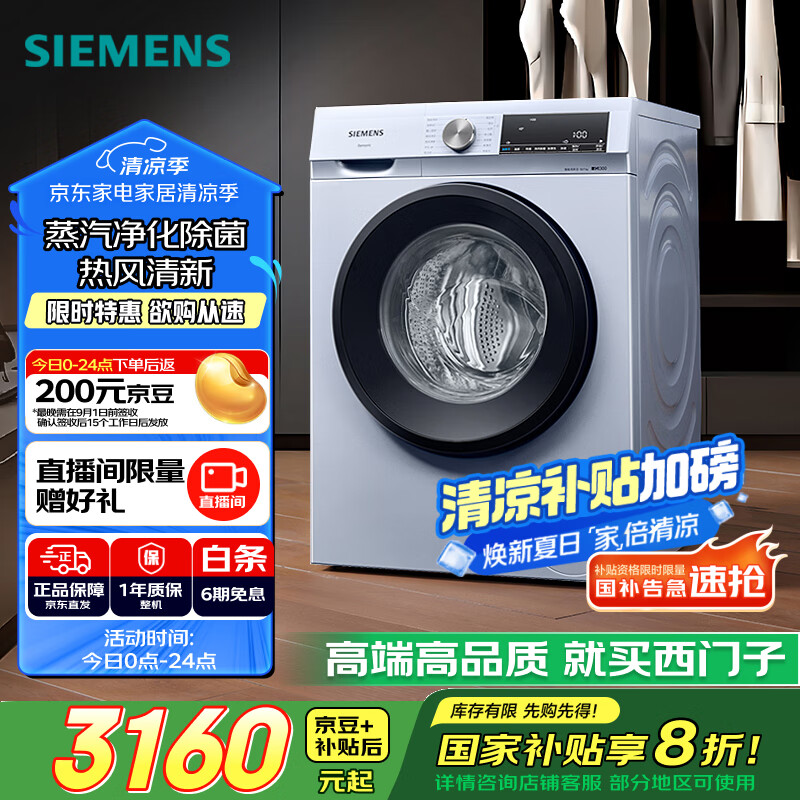 西门子(SIEMENS)10公斤滚筒洗衣机全自动带烘干 洗烘一体 蒸汽除菌 热风清新 双重净筒 X42W 家电国家补贴到手价格3899元。