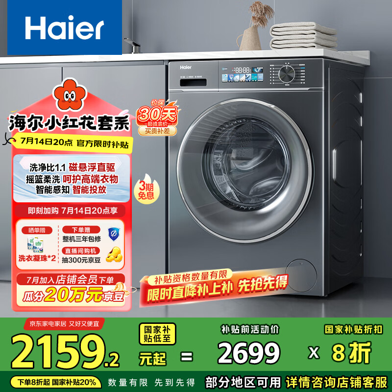 海尔(Haier)小红花套系 滚筒洗衣机全自动 10公斤 EG100BD88PLUS 家电国家补贴 以旧换新 一级能效 家用到手价格2599元。