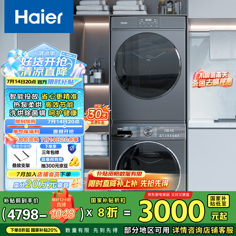 海尔(Haier)超薄系列 10KG滚筒懒人洗衣机+热泵烘干机家用 MATE55+36 已下市建议购买29+39套装 家电国家补贴到手价格4478元。