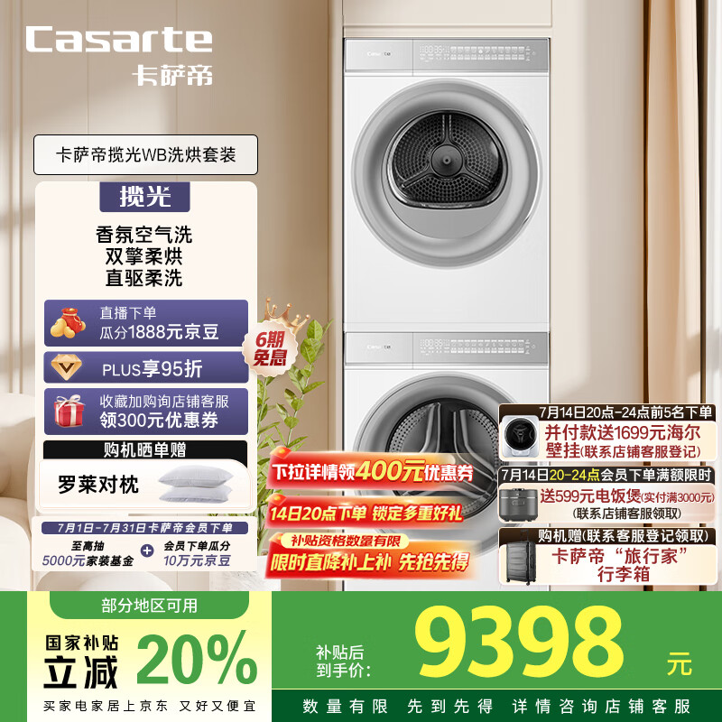 卡萨帝(Casarte)揽光WB【W2升级款】洗烘套装 滚筒懒人洗衣机+双擎热泵烘干机 智能投放 10LWB+10FWB 家电国家补贴到手价格11998元。