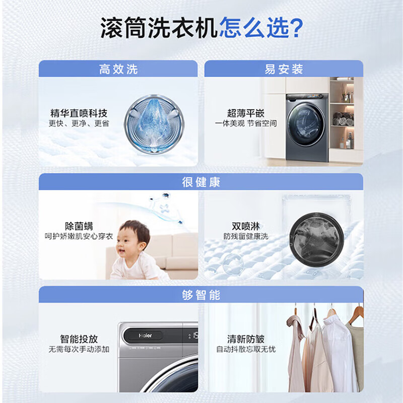 洗衣机很不错,还有除菌效果,大小也合适,一个人用刚好,有很多模式,可以自由选择。收到快递拿到就用上啦,很不错的一次购物。洗衣机还不错,直接放大洗衣机上面就可以,宝宝的衣服分开比较卫生,还是挺满意的,推荐。洗衣机海尔G10028BD14LS的洗衣机很是大气啊,看起来特别高级。之前家里买的就是的洗衣机,用了很多年,一直很好用,这次新家也优先考虑,还是洗烘一体非常不错,小巧不占地方,力道也非常大,功能齐全。宝宝衣服洗的很干净,还有蓝光杀菌功能。东西不错,洗衣效果很棒,衣服洗得干干净净。一键洗涤功能特别方便,省时省力,真是居家必备。使用一段时间后,感觉很满意!
