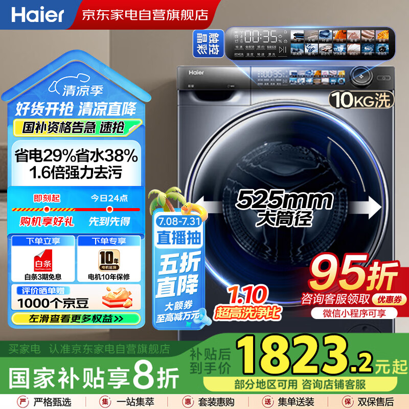 海尔(Haier)家用全自动滚筒洗衣机10公斤超薄平嵌525大筒径智能投放 家电国家补贴20% 以旧换新G10028BD14LS到手价格2499元。