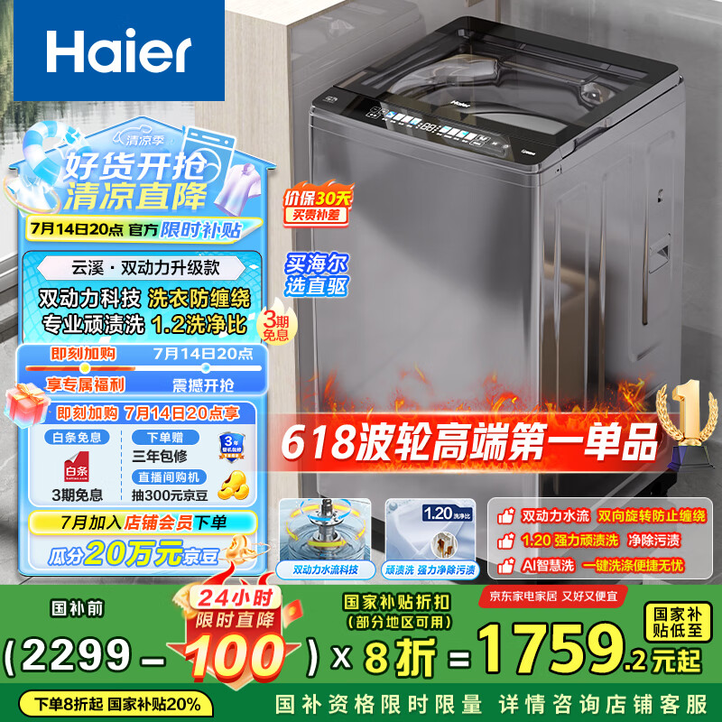 海尔(Haier)波轮洗衣机全自动家用10公斤大容量家电国家补贴20%以旧换新 直驱变频一级能效双动力XQS100-BZ659到手价格2069元。