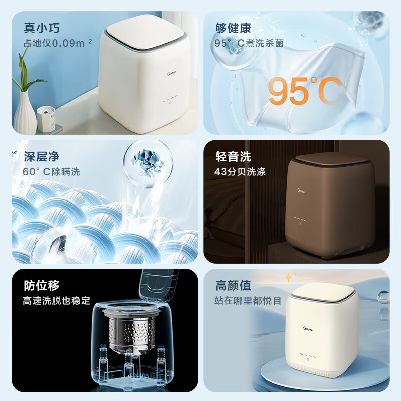 小小的一个,正好两个人用!也不占地方!物流也快!安装也方便!声音不是很大,可以接受!不影响休息!自己就可以安装!很方便!滚筒洗衣机真的很好用,声音也不大,体积比原来的小了,容量变大了,触摸屏一目了然,真棒洗衣机美的MNB7VH1E外形外观:外观设计风格非常时尚,颜值超高洗净效果:洗衣服非常干净,容量很大,功能齐全,价格实惠,做工精细,操作简单方便实用物流还挺快,完好无损。还没有使用,用一段时间了再来评论。外形外观:还挺好的容量大小:大专门用来洗内衣和袜子的。容量还不错。对于两个人的家庭来说,正正好。外观材质:一开始就看中了他的颜色和复古的造型。非常的精致