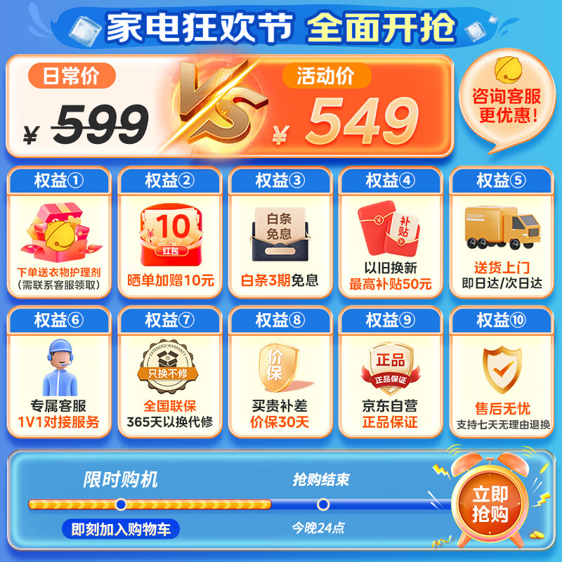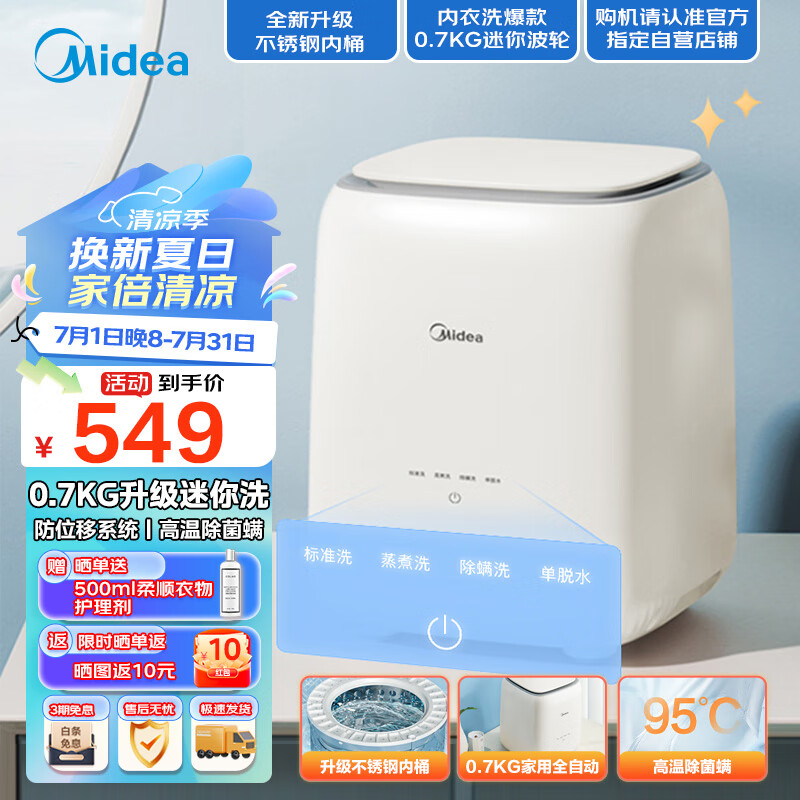 美的(Midea)0.7公斤内衣洗衣机家用内衣裤迷你懒人洗衣机高温除菌洗袜子全自动洗脱一体机不锈钢内桶MNB7VH1E到手价格494.1元。