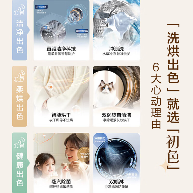 电辅加热洗涤,除螨洗,儿童安全锁,烘干/风干,筒自洁,脱水功能,中途添衣,除菌功能