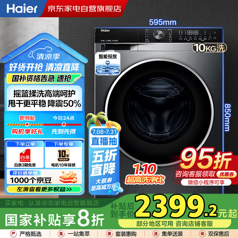 海尔(Haier)国家补贴丨滚筒洗衣机10公斤全自动直驱洗烘一体机带烘干超薄全嵌六维减震智能投放 EG100HBD59S到手价格3096元。