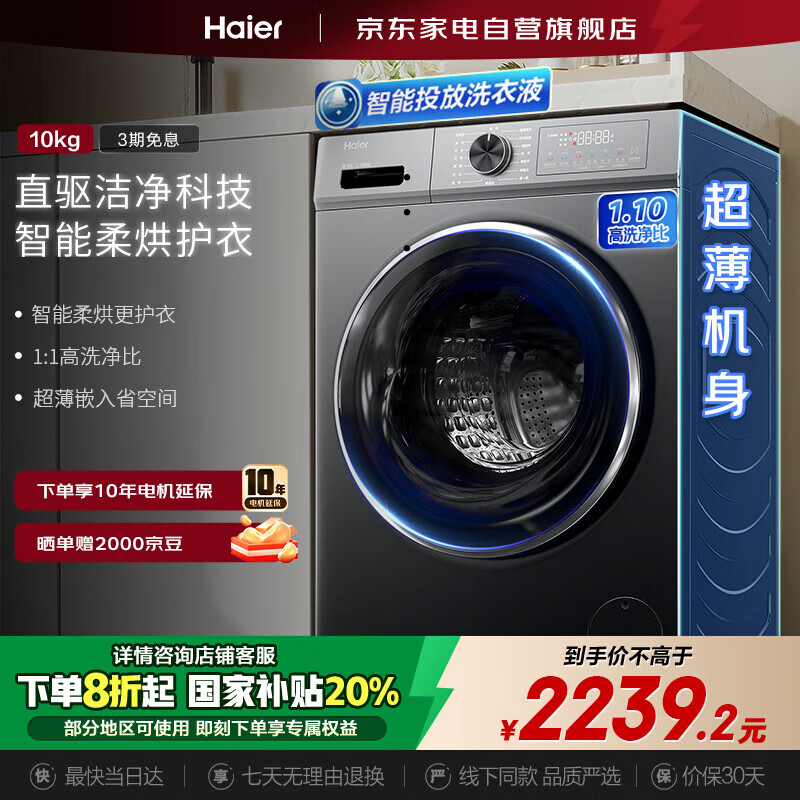 海尔(Haier)滚筒洗衣机10公斤全自动 洗烘一体 超薄嵌入 直驱变频一级能效 以旧换新国家补贴G10080HBD12S到手价格3099元。