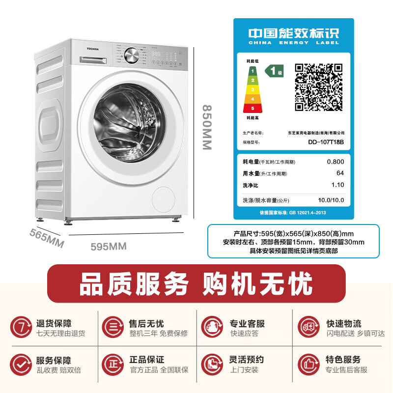 东芝DD-107T18B容量大小:十公斤的里边很大,家居日常使用足够了。外形外观:屏幕按键清晰明了,简洁方便。一级能耗使用着也很放心。推荐大家购买外观设计精美漂亮 安装方便 操作简单 噪音小 洗衣效果非常满意 送货到房间 非常满意可以哈,送货上门,送到安装的地方,也是上门来安装的。速度还是蛮快的。东西如图。价格很实惠。大容量。可以洗被子等大件了。洗衣机是不错的选择!外观大气上档次,内部结构耐用。今天洗了衣服,感觉不错,洗的干净!洗衣机的设计非常简约大气,白色外观百搭时尚。操作简单,功能实用;质量很好,性价比超高!强烈推荐给家庭用户,值得拥有!?