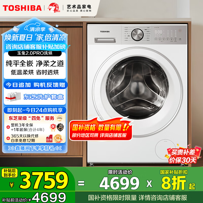 东芝(TOSHIBA)滚筒洗衣机全自动 玉兔2.0proDD-107T18B 带烘干洗烘一体10公斤 纯平全嵌以旧换新家电国家补贴20%到手价格4699元。