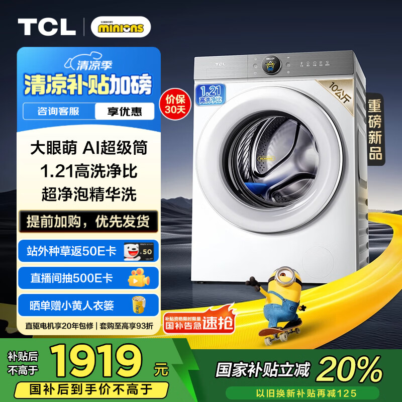 TCL 小黄人10公斤大眼萌AI超级筒 1.21洗净比滚筒洗衣机全自动家用家电国家补贴以旧换新G100T7R-DI到手价格2699元。