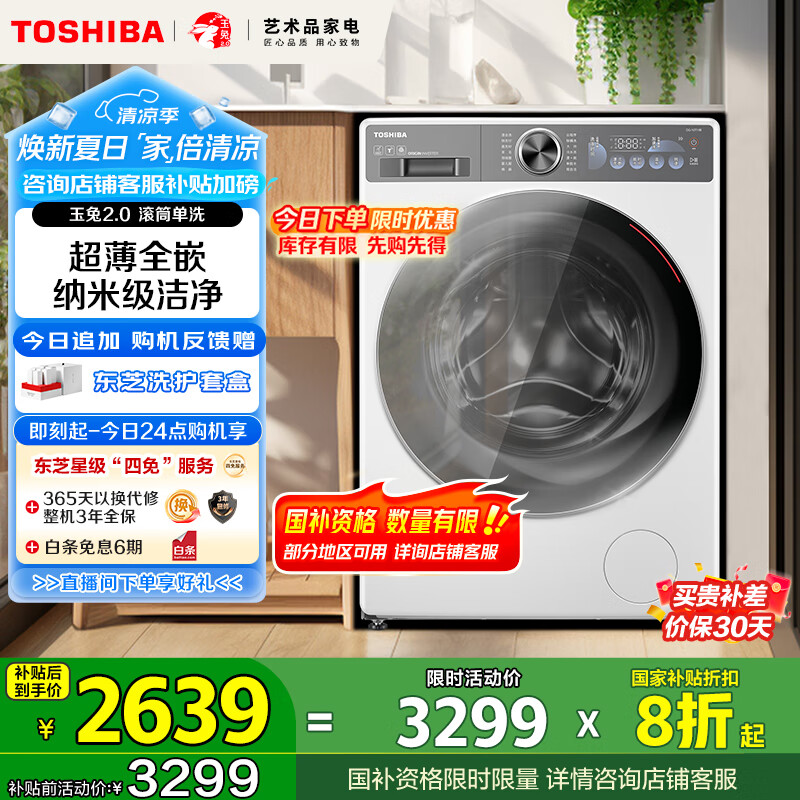 东芝(TOSHIBA)滚筒洗衣机全自动家用【玉兔2.0 DG-10T19B】超薄全嵌 10公斤大容量 以旧换新 家电国家补贴20%到手价格3599元。
