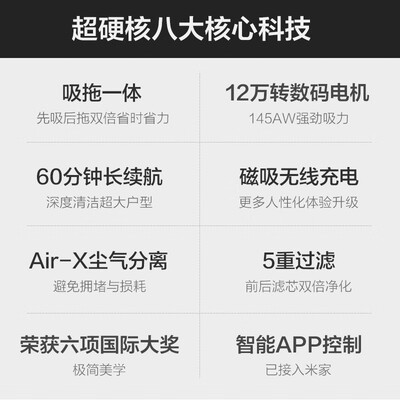 东西已经收到!手感不错!质量很好!平常用基本没有问题!吸力强,外观小巧,像是筋膜枪?充上电,随处可用,方便快捷,实用。吸力很大,清洁效果:床底的东西都吸出来了。拆洗便捷度:算挺简单粗暴的了吸尘器睿米吸尘器XCQ06RM吸尘器已经收到,安装方便。到货后立即开箱进行安装,并实操检验后,总体情况满意,品牌的就是放心,吸力强,噪音是可接受范围内。功率大,噪音小,吸力强弱:吸力强吸尘力度:可以做到无灰尘,太好了,特别棒噪音非常大,但吸力还可以,比的好,九件套对清理窗台很有用,总体来说还可以,基本可以满足家用,重量比较清,比较好挪动!