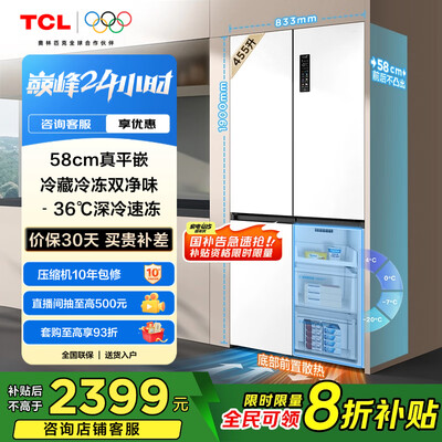 TCL大无界455升T9十字四开门58cm超薄平嵌入式双净味家用电冰箱大容量国家补贴20%一级能效R455T9-UQ目前活动价:2399.2元!