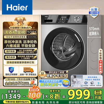 海尔(Haier)滚筒洗衣机全自动 懒人超薄家用10公斤大容量 MATE29S相似款 以旧换新 一级能效 家电国家补贴20% 行业销冠丨热销百万丨顽固洗冲浪洗MAX29S首页购物车我的客服手机查看反馈提建议举报目前活动价:999.2元!