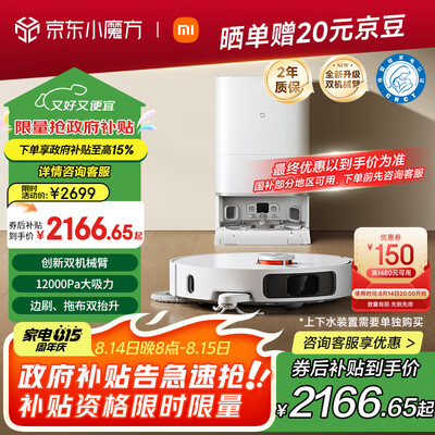 云鲸【政府补贴】扫地机器人逍遥001Max 扫拖一体自动清洗全自动拖地洗地地机 机械臂外扩0缠绕 水箱版目前活动价:3331.15元!