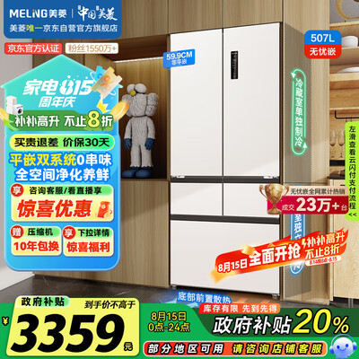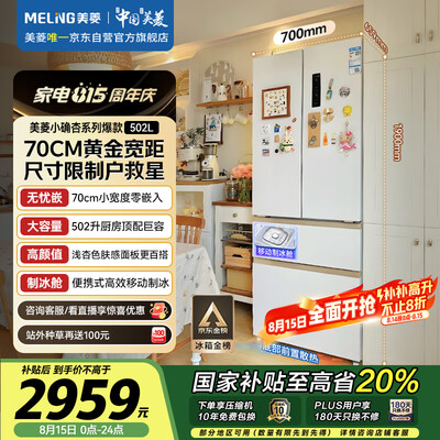 美菱(MeiLing)小确杏502升法式四开门冰箱70cm宽制冰超薄零嵌入大容量一级变频底部散热国家补贴BCD-502WFP9CZX目前活动价:2959.2元!